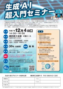 2025年12月4日に備前商工会議所様で行うセミナー「生成AI超入門セミナー」は募集開始早々に定員となり、キャンセル待ちとなりました。生成AIへの強いご興味がある事業者様が多いということだと思います。 他の商工団体様から […]